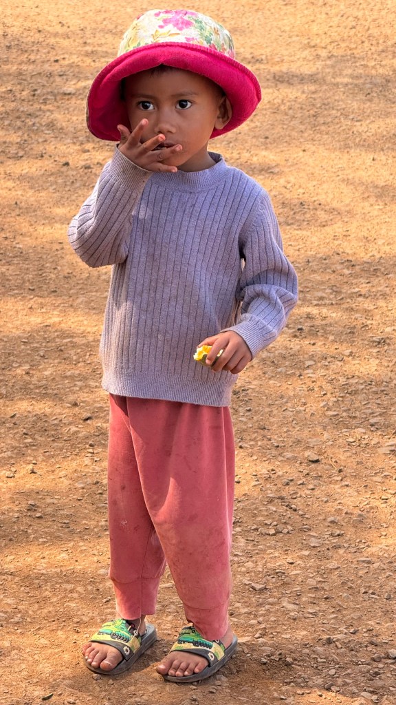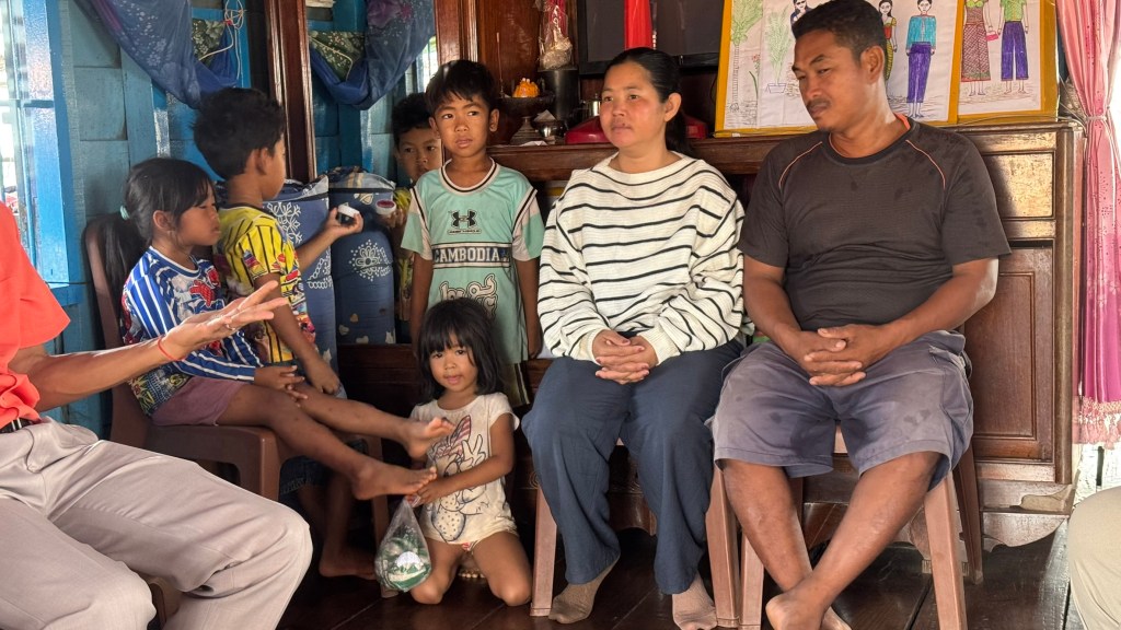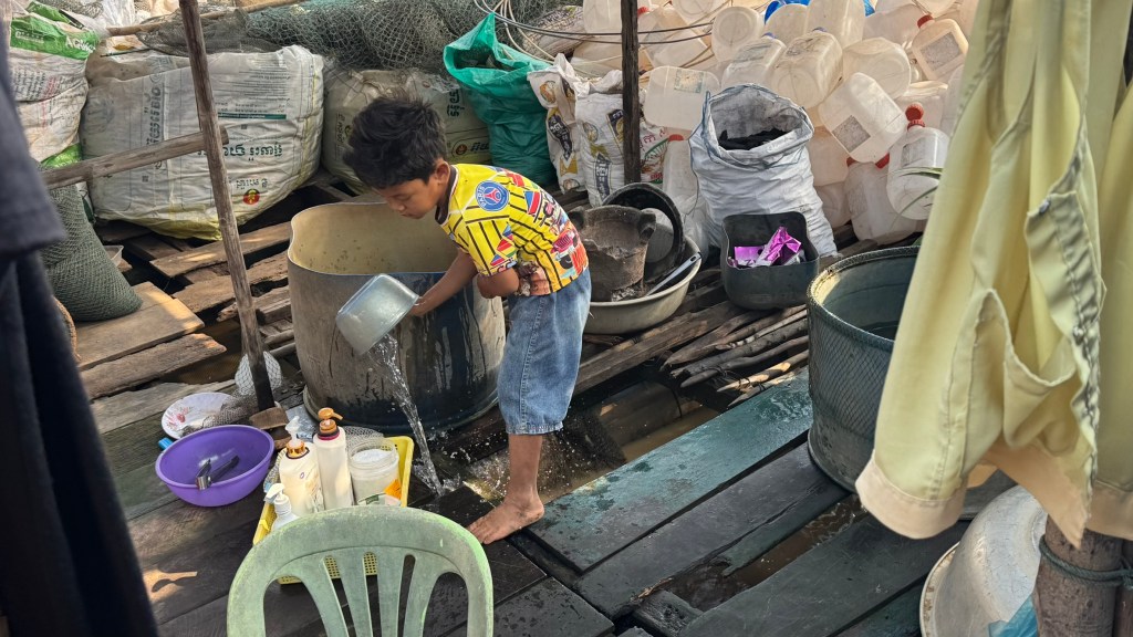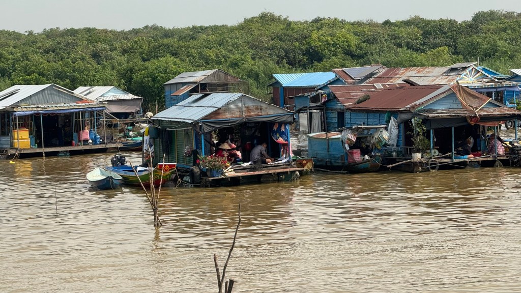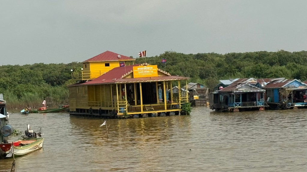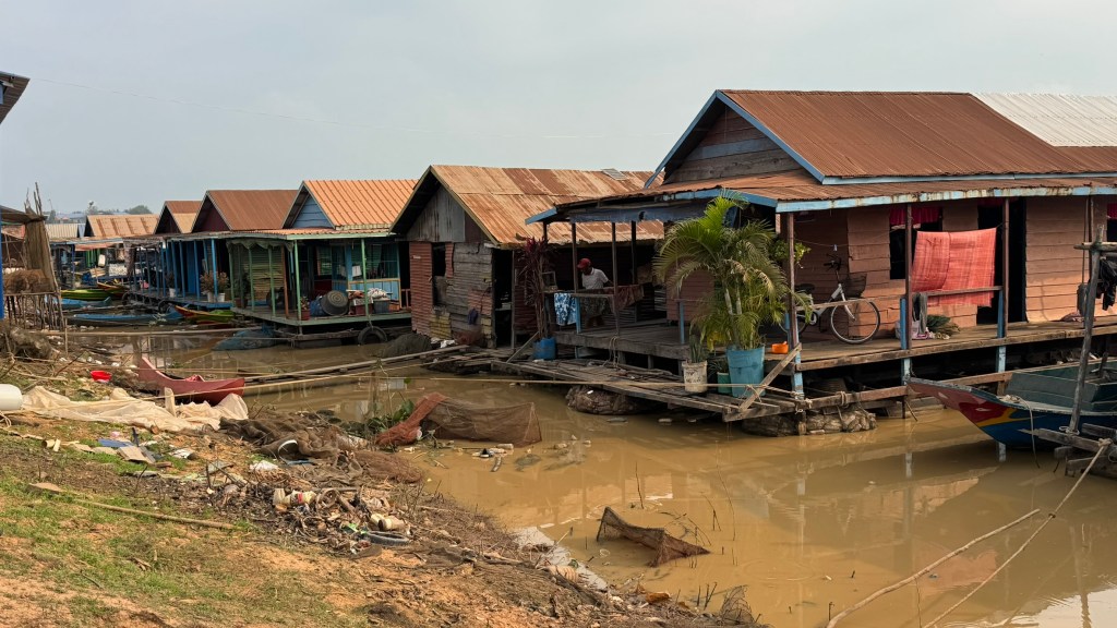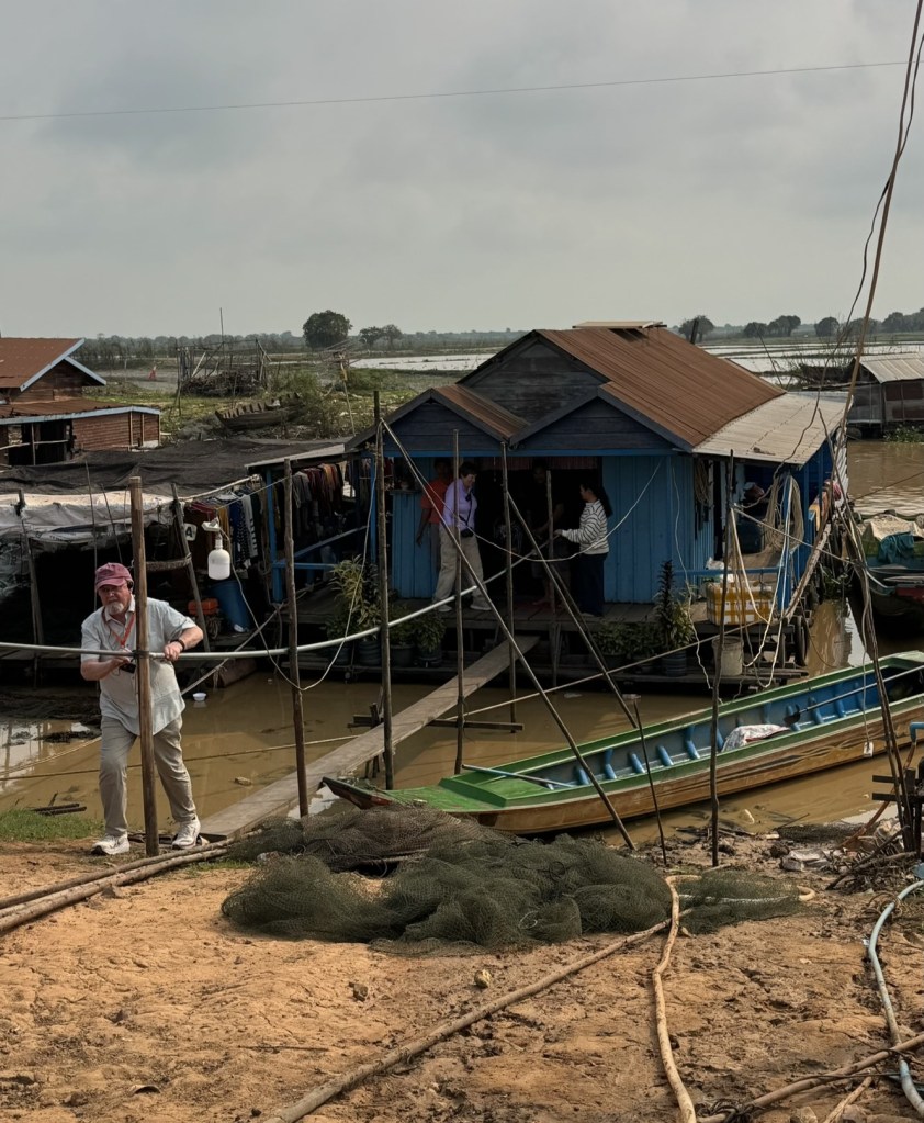 On Saturday, Feb. 7th, we drove from Siem Reap, Cambodia, to a large lake called Tonle Sap Lake. This is the largest freshwater lake in SE Asai, and is a geographical wonder. We learned en route that the river feeding into this lake CHANGES CURRENT DIRECTION twice yearly as the water flows from high mountains to the north during the rainy season. We were there during the dry season so the river was at its lowest, and many of the floating homes were docked near the shore. The families all depend on their fishermen for support. Everything is floating in this area, including shops, churches and even schools. First, we visited a local family in their floating home.